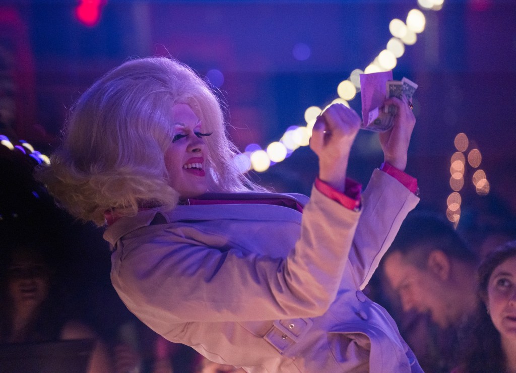 A fan hands money to the host during the Boybutante Ball at 40 Watt on Saturday, April 23, 2022.