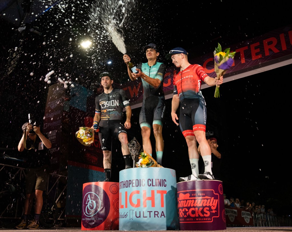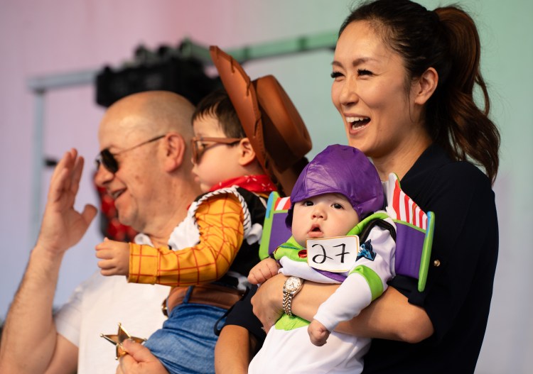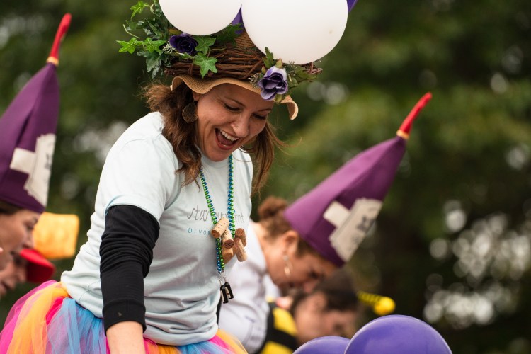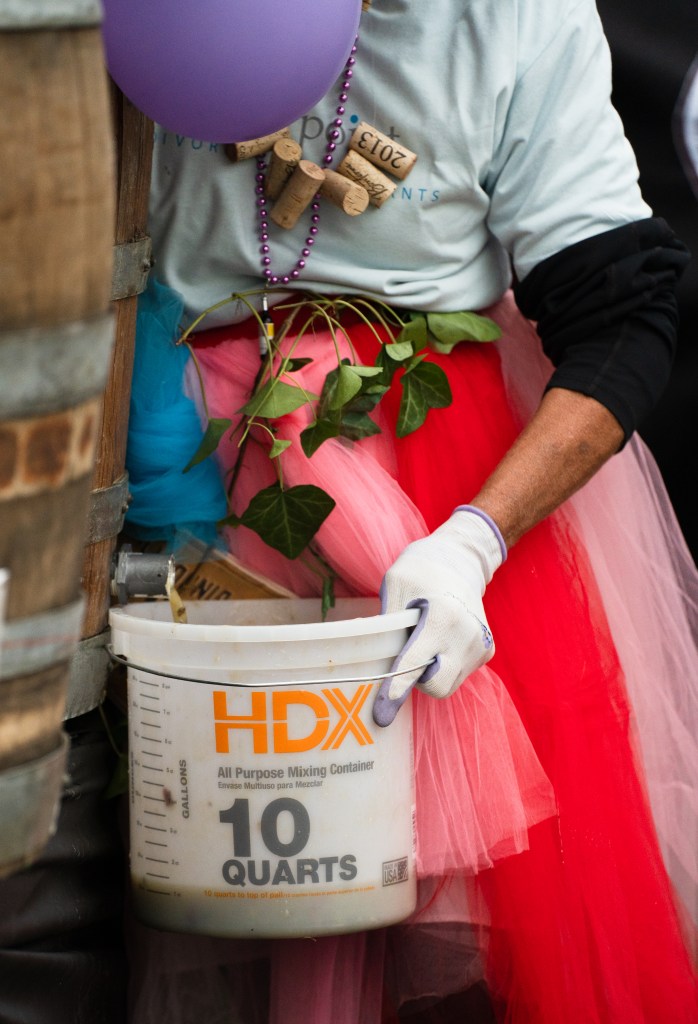 A “swabby” holds their team’s juice collection at the 13th annual Grape Stomp hosted by A Vintage Affair at the Factory at Franklin on Saturday, Oct. 14, 2023.