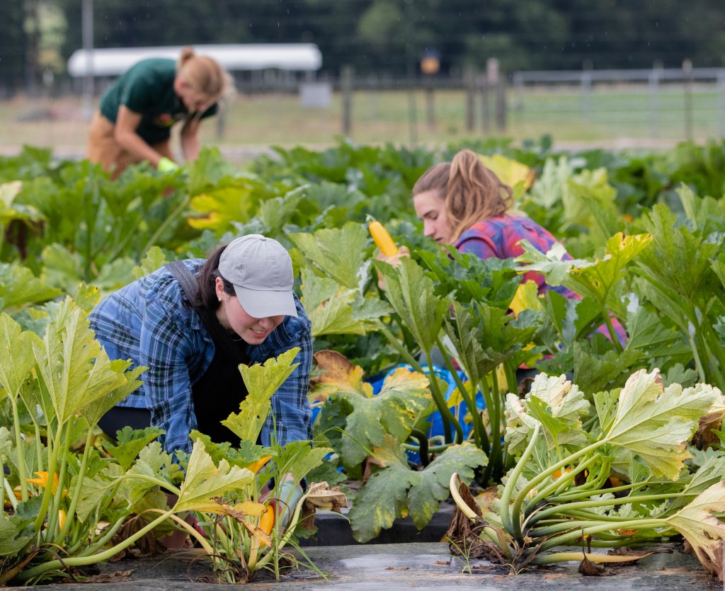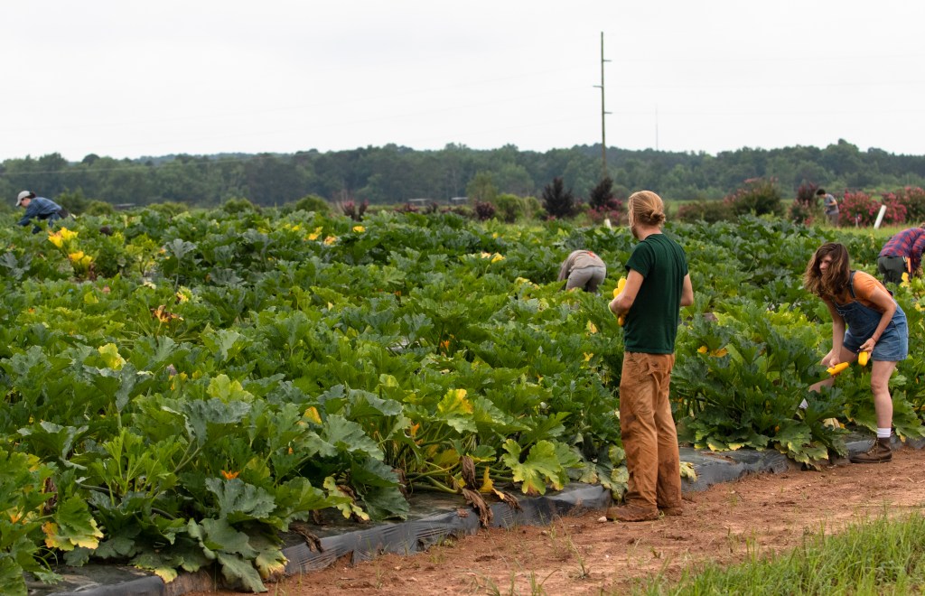 Concrete Jungle volunteers harvest zucchini at the UGA horticulture farm on Tuesday, July 13, 2021. In addition to farm-grown produce, Concrete Jungle harvests fruit from under-utilized trees around the city. (Photo/ Sarah White)