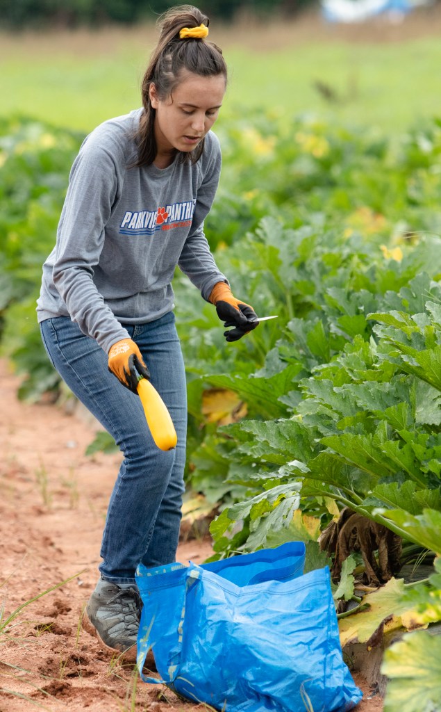 A volunteer places zucchini into a bucket during the harvest at UGA’s horticulture farm on Tuesday, July 13, 2021. Each bucket of zucchini is weighed and then transported to the food bank of Northeast Georgia. (Photo/ Sarah White)