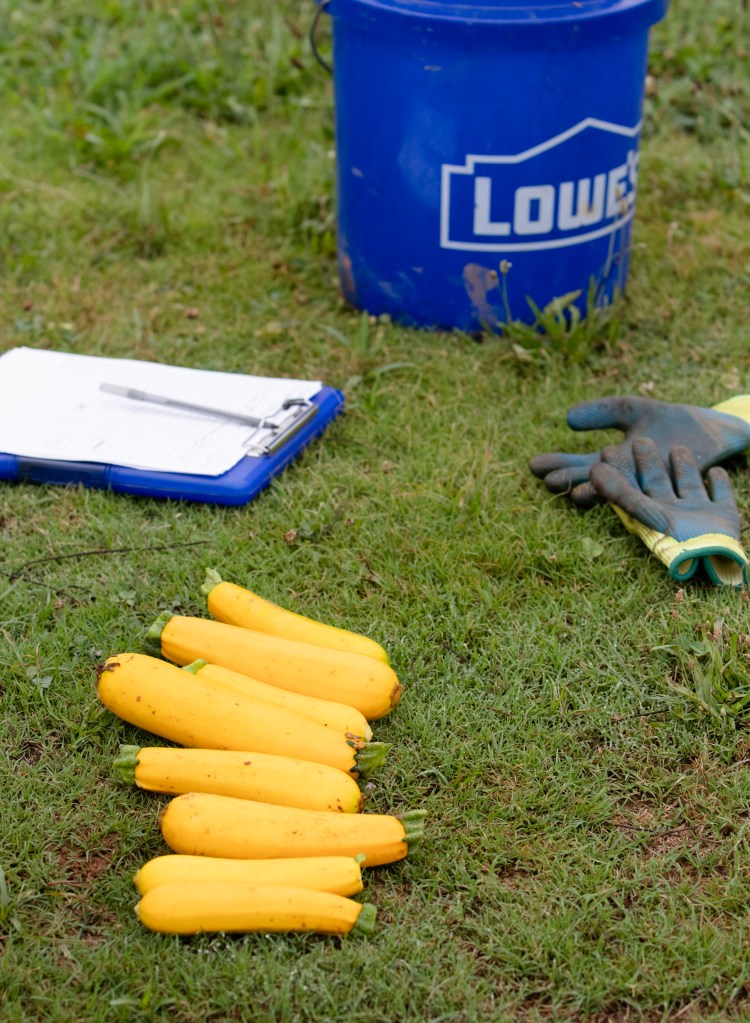 Zucchinis and research tools are pictured at the UGA horticulture farm on Tuesday, July 13, 2021. The harvested zucchini is weighed before being loaded and transported to the food bank. (Photo/ Sarah White)