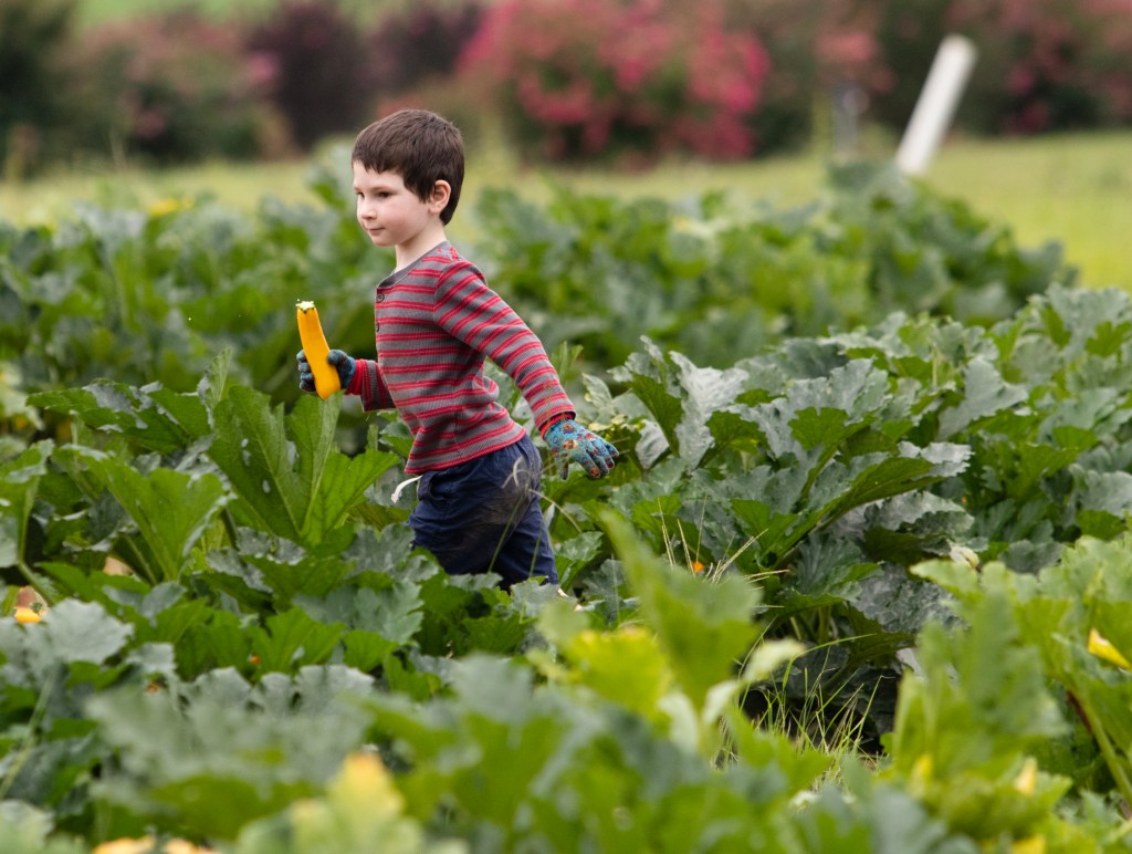 A volunteer carries a zucchini during Concrete Jungle’s harvest on Tuesday, July 13, 2021. Volunteers do not need agricultural experience to join COncrete Jungle’s harvests.(Photo/ Sarah White)