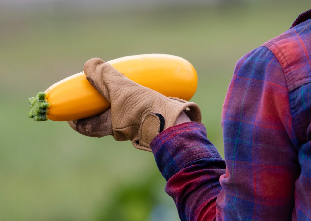 A volunteer holds a yellow zucchini during the harvest for Concrete Jungle at the UGA horticulture farm on Tuesday, July 13, 2021. Yellow and green varieties of zucchini squash were harvested. (Photo/ Sarah White)