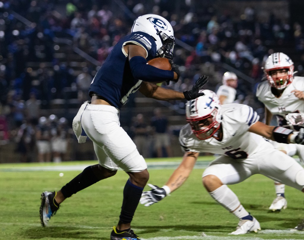 Christian Harris, Junior wide receiver for Elbert County, dodges a tackle in the first quarter of the game against Haralson county on Friday, October 1, 2021. Jason Groves, Freshman defensive back for Haralson County made the tackle to end the play. (Photo/Sarah White, saw86124@uga.edu)
