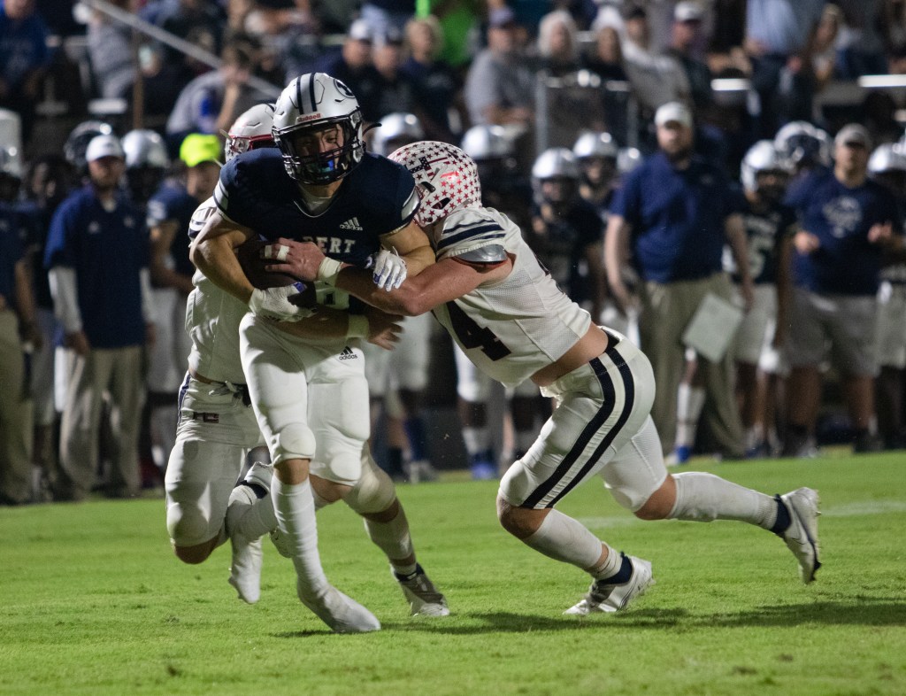 Carson Adams, Senior wide receiver for Elbert County, attempts to run through a tackle on Firday, Oct. 1, 2021. Kaden Mullins, Senior linebacker for Haralson County, tackled Adams to end the play. (Photo/Sarah White, saw86124@uga.edu)