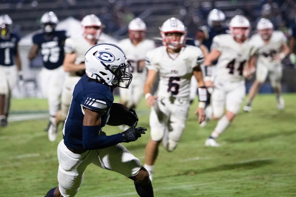 Trustin Allen, Senior wide receiver for Elbert County, misses a pass mid-air on Friday, October 1, 2021. The miss resulted in a turnover. (Photo/Sarah White, saw86124@uga.edu)