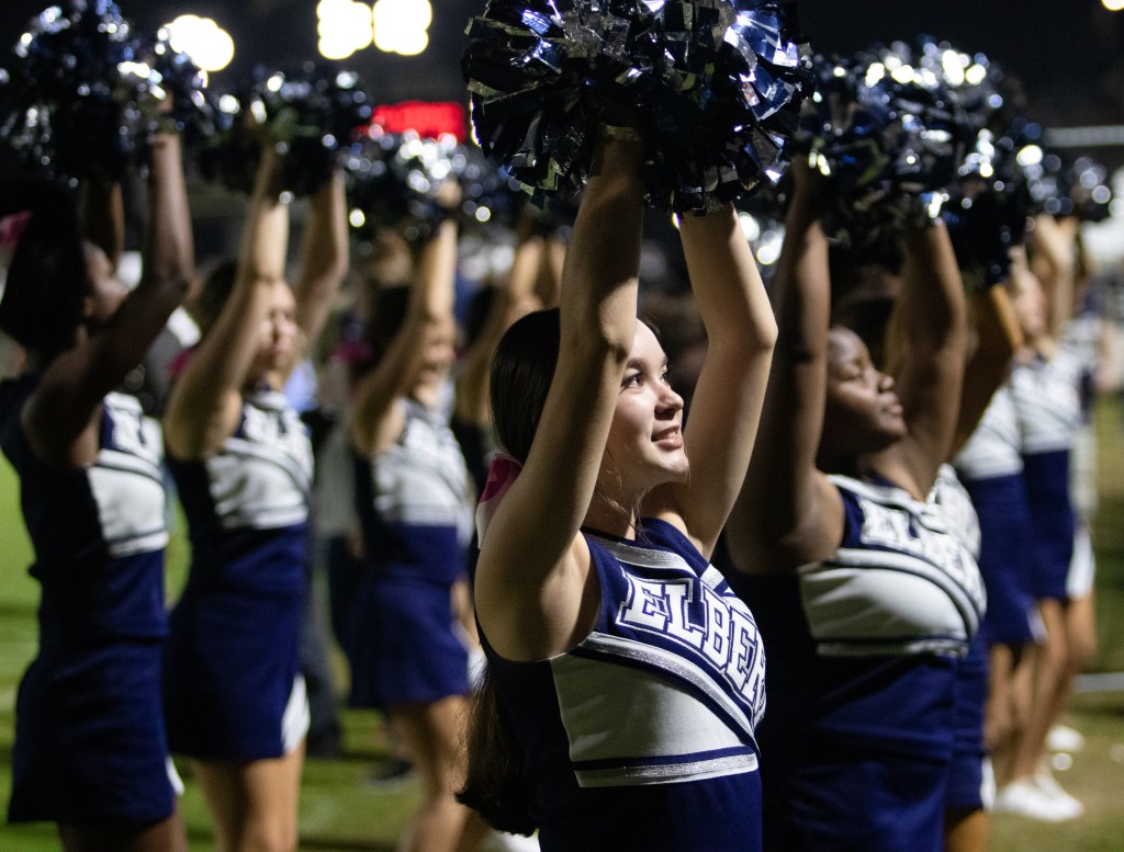 Elbert County cheerleaders face the crowd during the game high school football game against Haralson County on Friday, October 1, 2021. Elbert County lost their lead in the second half and spectators and cheerleaders cheered for a rally. (Photo/Sarah White, saw86124@uga.edu)