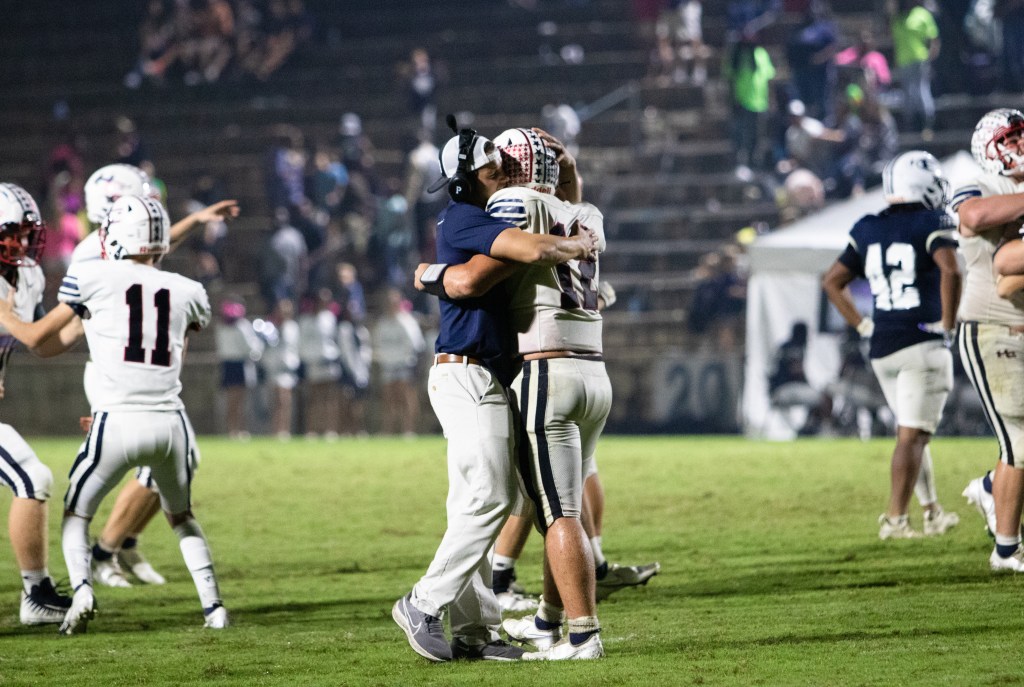 A Haralson County football coach hugs one of his players after winning the game at Elbert County High School on Friday, October 1, 2021. After trailing in the first half, Haralson county came back to win the game 26 – 21. (Photo/Sarah White, saw86124@uga.edu)