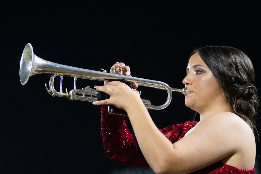 An Elbert County band member performs after the game against Haralson County on Friday, October 1, 2021. The night was the homecoming game and this performer was also a homecoming court member. (Photo/Sarah White, saw86124@uga.edu)