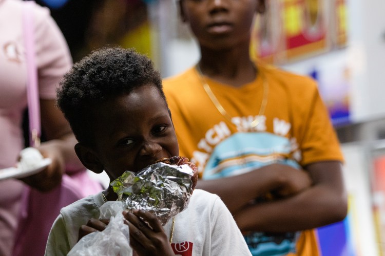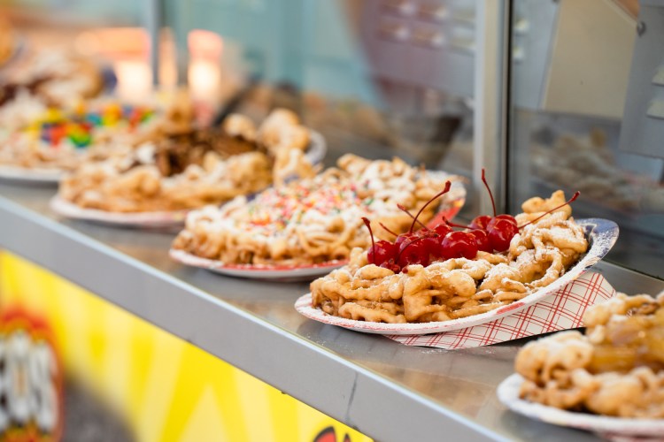 A child bites into his food at the Georgia National Fair in Perry, Ga. on Friday, October 8, 2021. Fair food is an iconic tradition at fairs across the country.