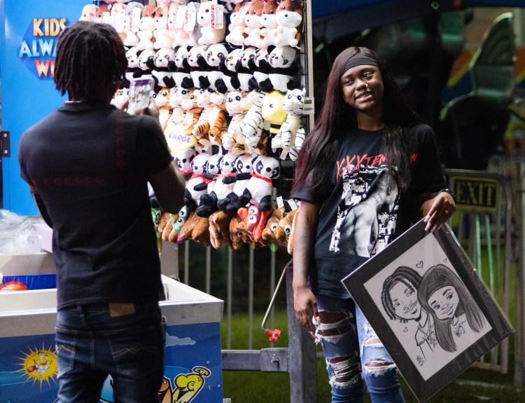 Que Moore photographs his girlfriend Ylencia Warner at the Georgia National Fair in Perry, Ga. on Friday, Oct. 8, 2021. The couple had a caricature drawing made for them at the fair.