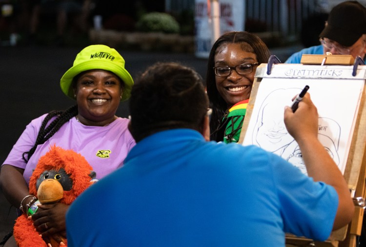 Visitors to the fair sit to be drawn in caricature at the Georgia National Fair in Perry, Ga. on Friday, Oct. 8, 2021. One booth at the fair offered caricature drawings from several artists.
