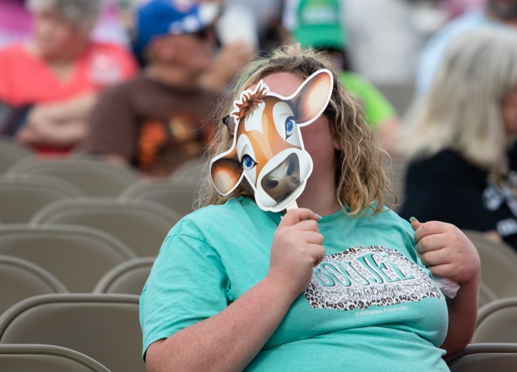 A woman holds a paper fan in front of her face at the Georgia National Fair in Perry, Ga. on Saturday, Oct. 9, 2021.