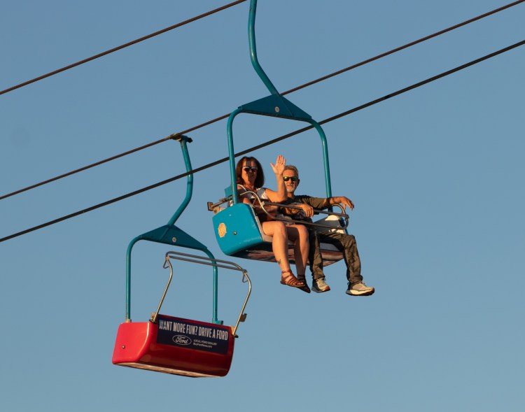 Two visitors wave as they pass over the fair grounds on the gondola at the Georgia National Fair in Perry, Ga. on Saturday, Oct. 9, 2021.