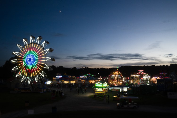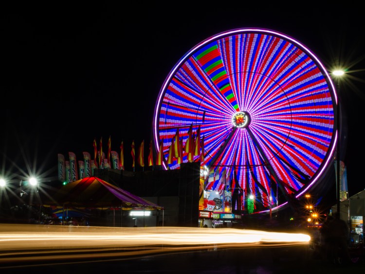 A ferris wheel rotates at the Georgia National Fair on Saturday, Oct. 9, 2021. At night, the fair lights up with colorful rides, games and vendor stands.