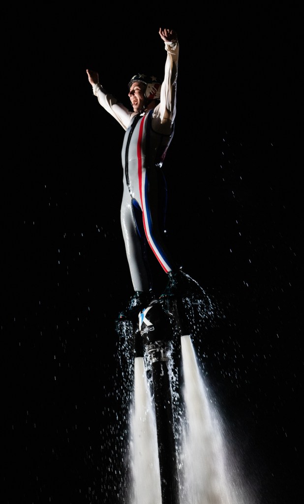 Tyler Elliot cheers while riding his skyboard in the watershow at the Georgia National Fair in Perry, Ga. on Saturday, Oct. 9, 2021.