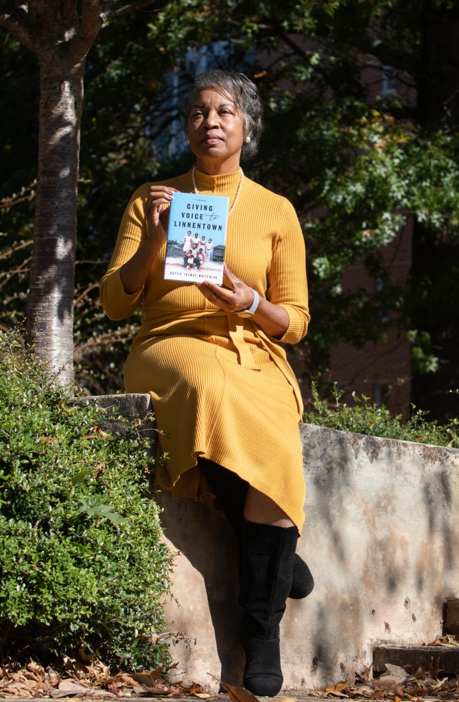 Hattie Whitehead, former resident of Linnentown, poses for a photo outside of Creswell Hall with her book’ “Giving Voice to Linnentown” on Monday, Oct. 18, 2021 in Athens, Ga. The dormitory high rise building stands where Linnentown, a predominantly Black neighborhood, once stood. Photo/ Sarah White