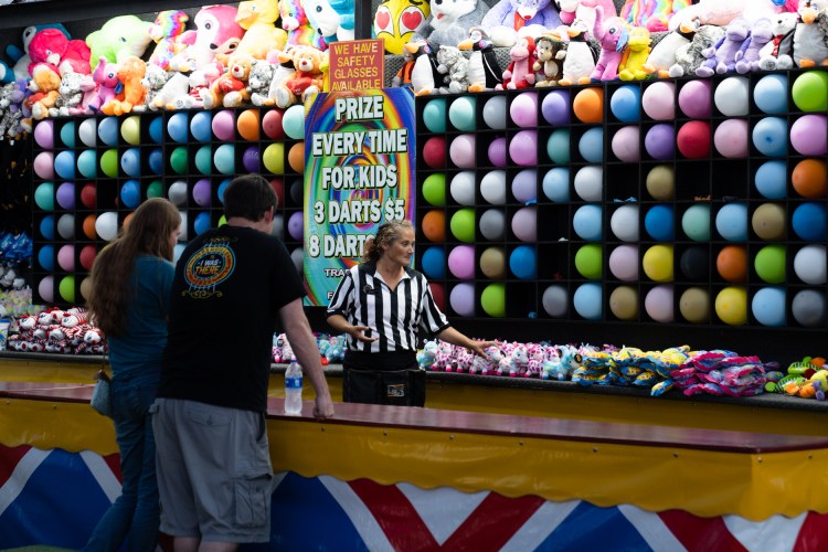 Tina Sir carries toys to a vendor before opening at the Georgia National Fair in Perry, Ga. on Saturday, Oct. 9, 2021. Sir has worked at the fiar for 20 years.