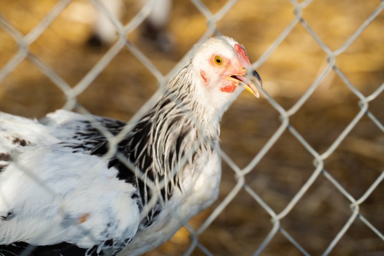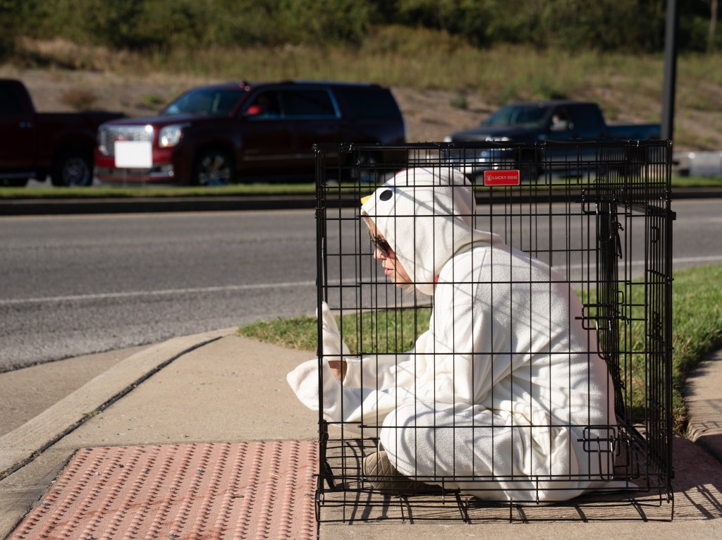 Activist Taryn sits in a cage while wearing a chicken costume during a protest by Humane League Activists at the headquarters of CKE in Franklin on Thursday, Oct. 17, 2024.