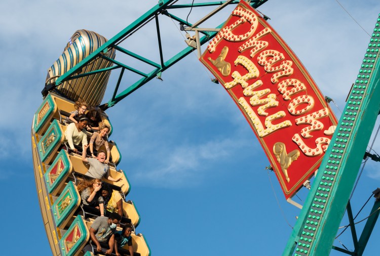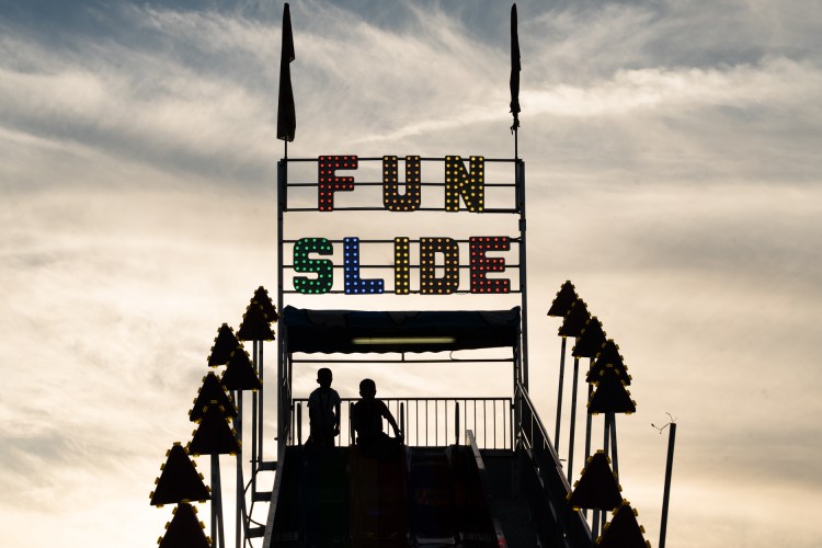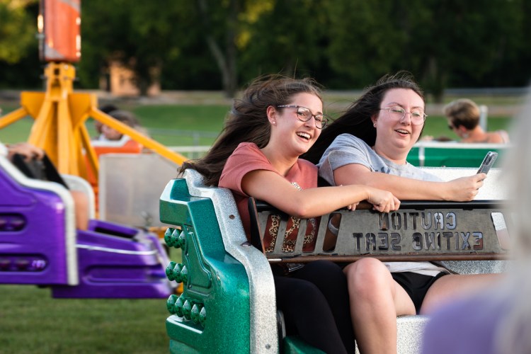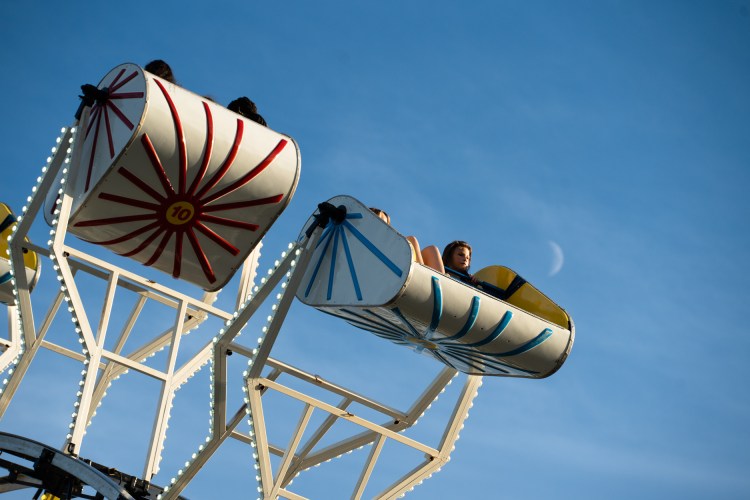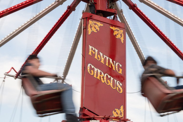 Two people wearing cowboy boots and Crocs are pictured on the YoYo swing ride at the Georgia National Fair in Perry, Ga. on Saturday, Oct. 9, 2021.
