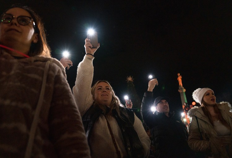 Spectators hold their phone flashlights in the sky for the playing of “Silent Night” at the Franklin Christmas Tree Lighting on the Square event on Friday, Dec. 2, 2022. West asked the audience to raise their lights and sing along as he performed the Christmas classic.