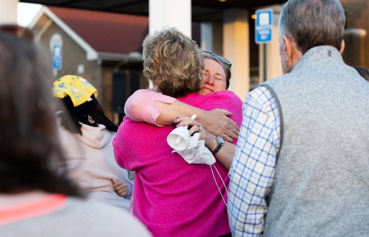 Community members hug each other at a candlelight vigil held for Evelyn Dieckhaus on Thursday, Mar. 20, 2023 at High Hopes Development Center in Franklin, Tn. 9-year-old Dieckhaus was one of six victims of Monday’s shooting at Covenant School in Nashville. Photo/Sarah White
