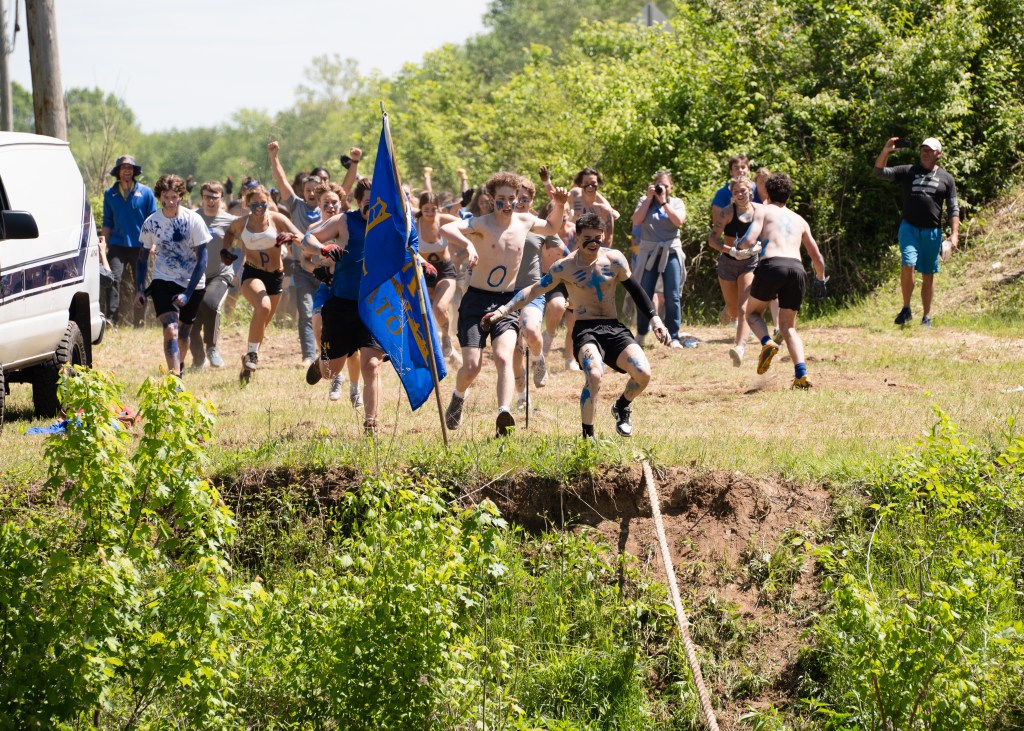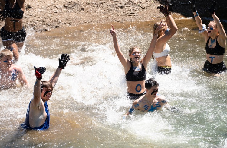 Platos literary society students celebrate after their team victory at Battleground Academy’s 84th annual tug-of-war competition over the Harpeth River on Tuesday, April 25, 2023. Photo/Sarah White