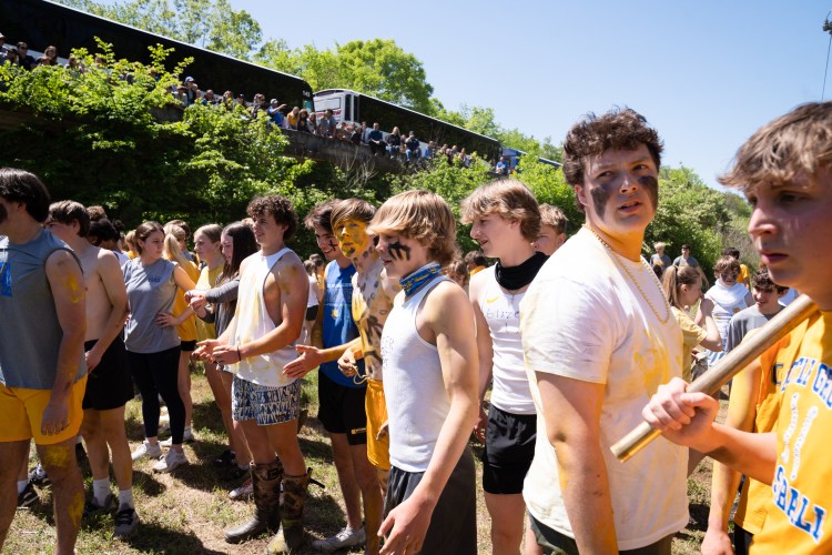 Greer literary society students watch their rival team celebrate after they were defeated at Battleground Academy’s 84th annual tug-of-war competition over the Harpeth River on Tuesday, April 25, 2023. Photo/Sarah White