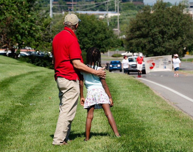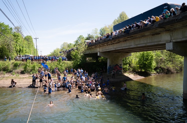 Parents and family members of the students watch the competition from the bridge on Highway 96 during Battleground Academy’s 84th annual tug-of-war competition over the Harpeth River on Tuesday, April 25, 2023. Photo/Sarah White