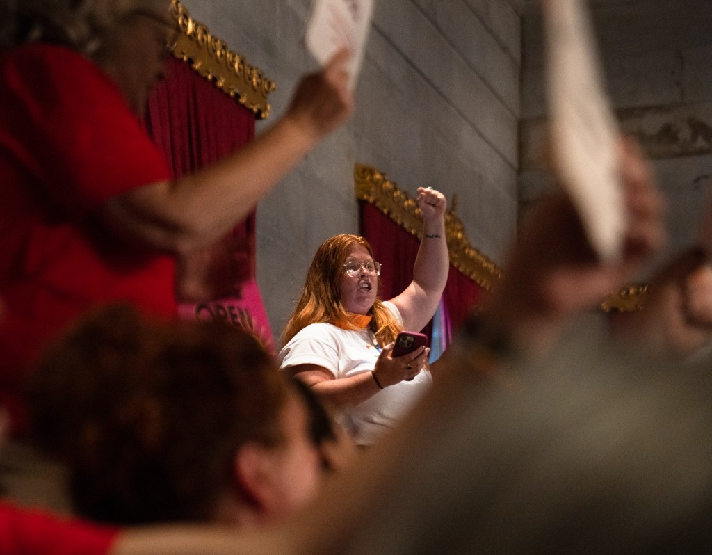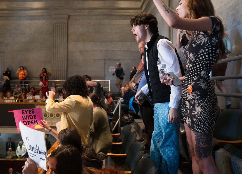 Aiden Pratt yells from the senate gallery during the Tennessee General Assembly’s special session on public safety and gun control on Thursday, Aug. 24, 2023. Photo/Sarah White