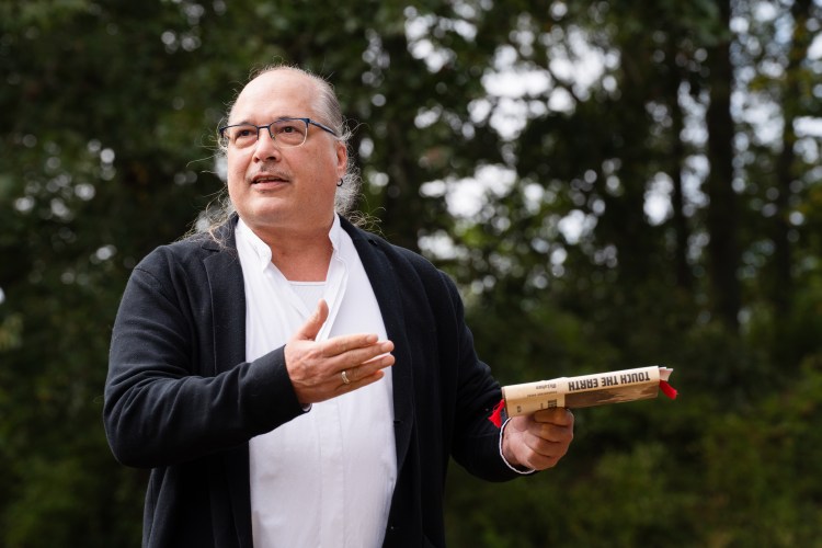 Tom Kunesh passes tobacco around for the audience to sprinkle on the site at the signing of the conservation easement to protect the Glass Mounds historic Indigenous site at Westhaven Golf Club on Monday, Oct. 9, Indigenous Peoples’ Day, 2023.