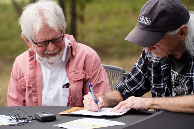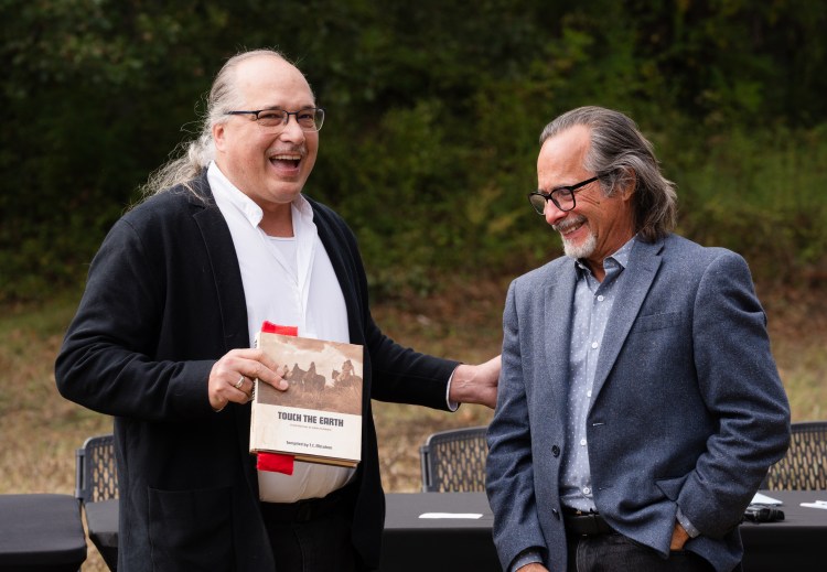 Tom Kunesh gives a copy of “Touch the Ground” to Mark Mallaganes at the signing of the conservation easement to protect the Glass Mounds historic Indigenous site at Westhaven Golf Club on Monday, Oct. 9, Indigenous Peoples’ Day, 2023.