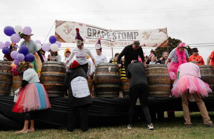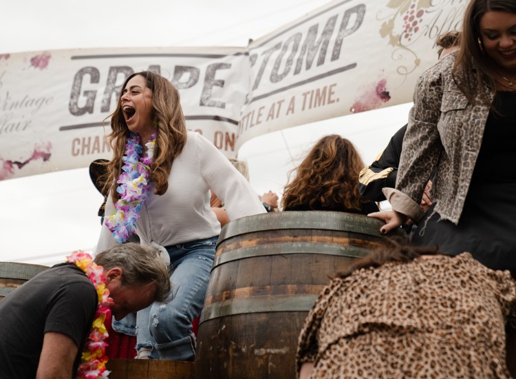 Competitors stand in barrels full of grapes and use their bare feet to squeeze out juice at the 13th annual Grape Stomp hosted by A Vintage Affair at the Factory at Franklin on Saturday, Oct. 14, 2023.