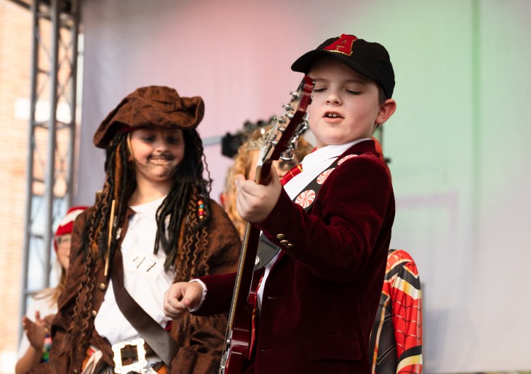 Children watch the performances behind a baracade at the Franklin Christmas Tree Lighting on the Square event on Friday, Dec. 2, 2022.