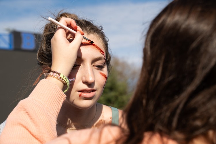 Linley Macmillan has bloody makeup put on her before the mock drunk driving crash at Brentwood High School on Thursday, Nov. 30, 2023.