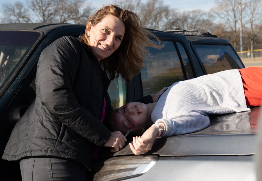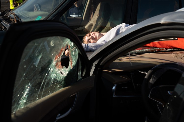 Linley Macmillan smiles as she gets into place for the mock drunk driving crash at Brentwood High School on Thursday, Nov. 30, 2023.