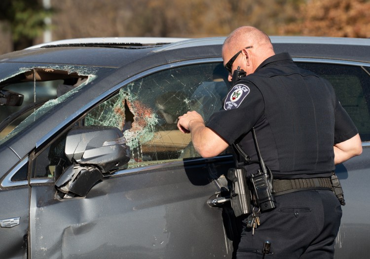 A Brentwood Police officer inspects the scene of the mock drunk driving crash at Brentwood High School on Thursday, Nov. 30, 2023.