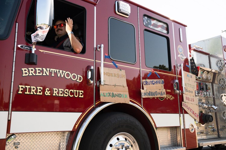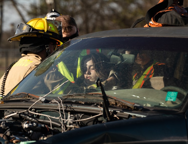 The Brentwood Fire and Rescue team pulls Kinsely Reid out of a car during the mock drunk driving crash at Brentwood High School on Thursday, Nov. 30, 2023.