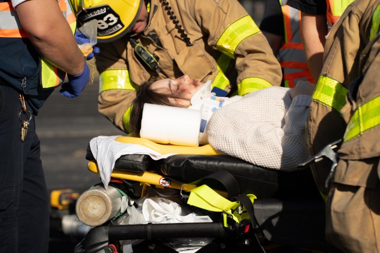Kinsely Reid is transported to an ambulance during the mock drunk driving crash at Brentwood High School on Thursday, Nov. 30, 2023.