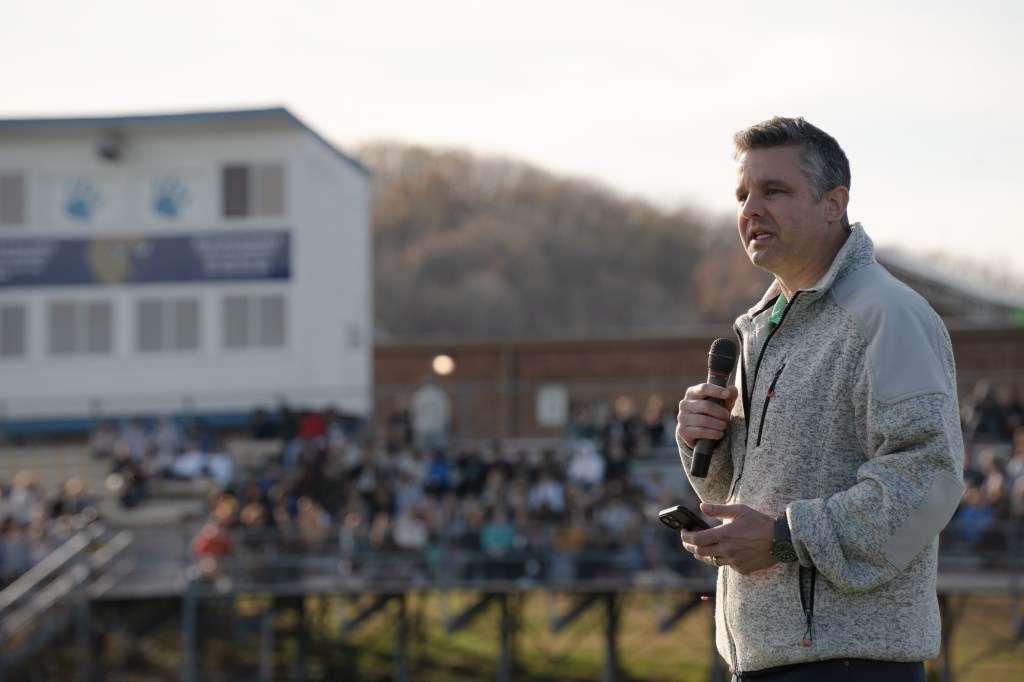 Derrick Smith shares his story with students after the mock drunk driving crash at Brentwood High School on Thursday, Nov. 30, 2023.