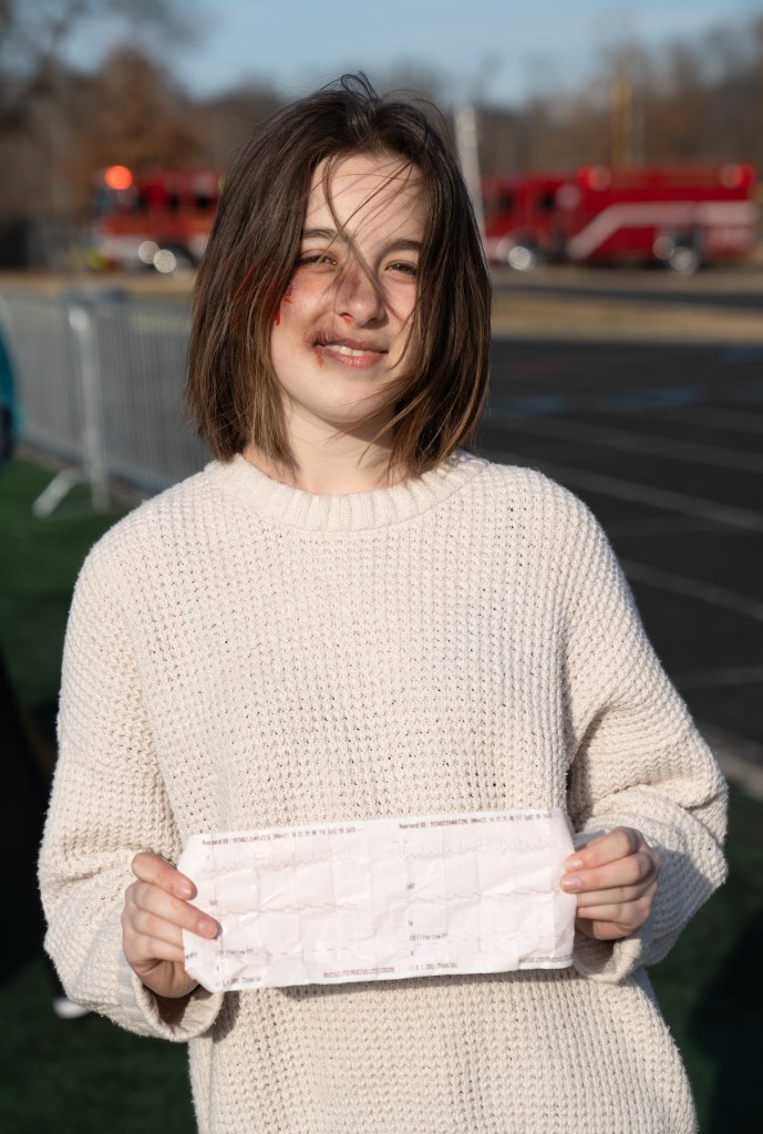 Kinsely Reid poses for a photo with her EKG reading from the ambukance after the mock drunk driving crash at Brentwood High School on Thursday, Nov. 30, 2023.