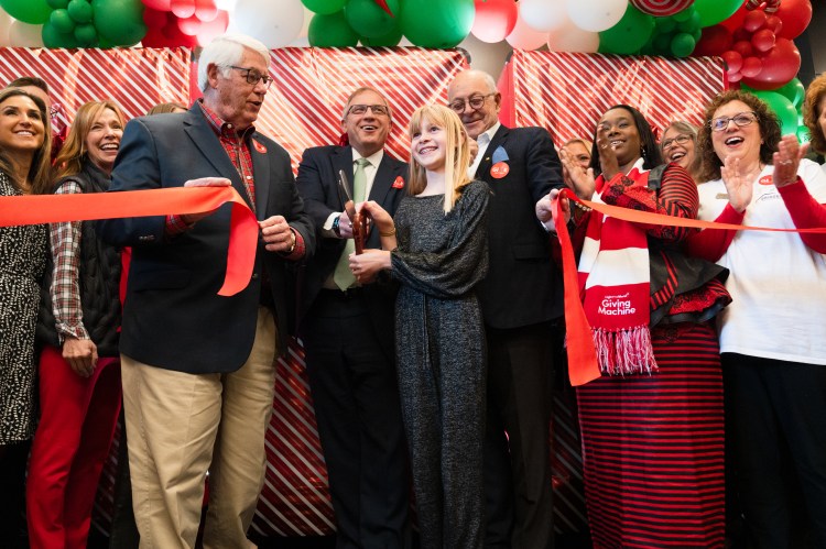 Lillian Barton helps Rogers Anderson, Greg Scott, Ken Moore and others cut the ribbon for the Light of the World Giving Machines in downtown Franklin on Friday, Dec. 1, 2023.