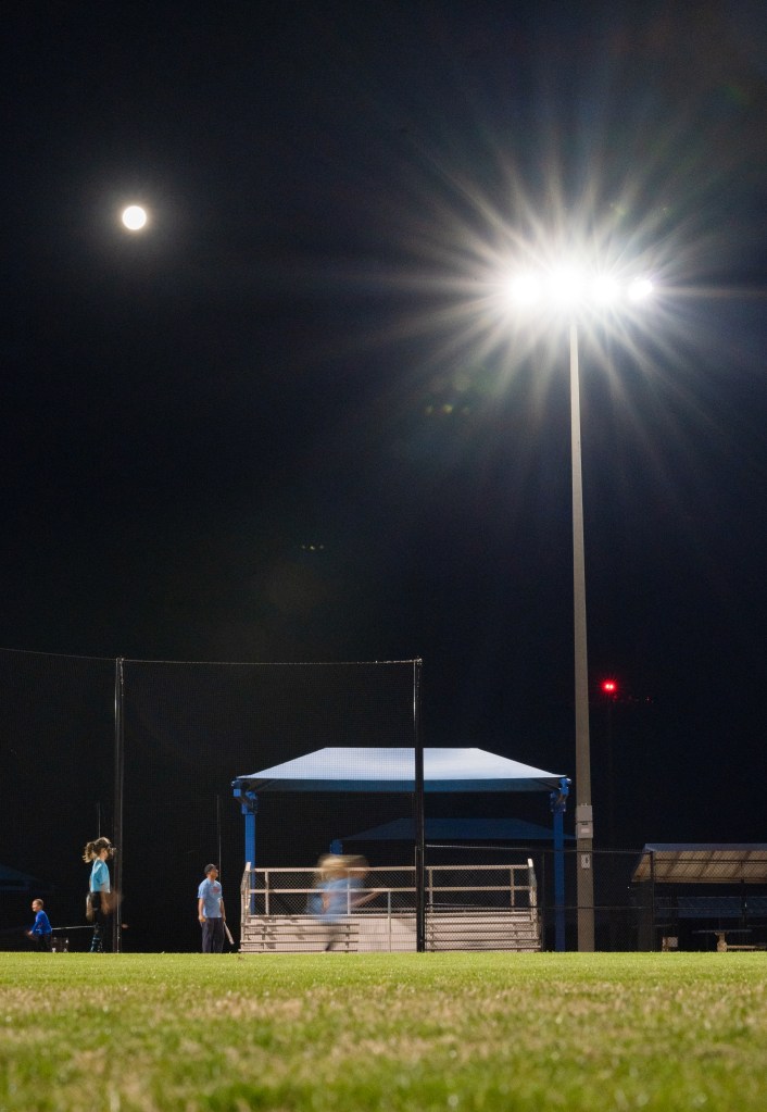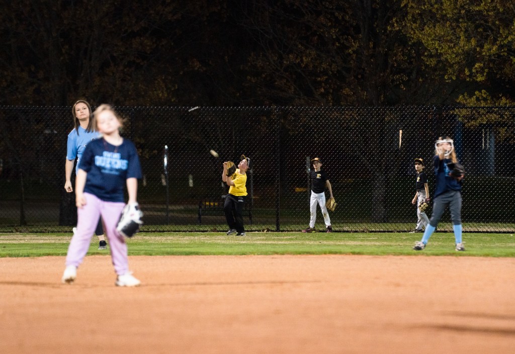 A baseball team practices in the outfield while the Swing Queens Softball team uses the infield for practice at McKnight Park in Murfreesboro, Tn. on Monday, Mar. 6, 2023. The baseball team had planned to practice on a neighboring field, but when the lights on their field were never turned on, the Swing Queens offered to share the field they had reserved. Photo/ Sarah White