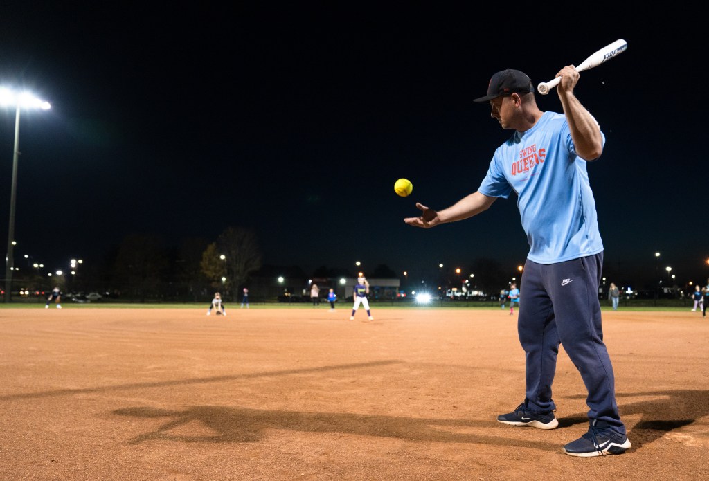 Kenny Jordan, coach of the 8U Swing Queens softball team, hits to his players during practice at McKnight Park in Murfreesboro, Tn. on Monday, Mar. 6, 2023. Photo/ Sarah White