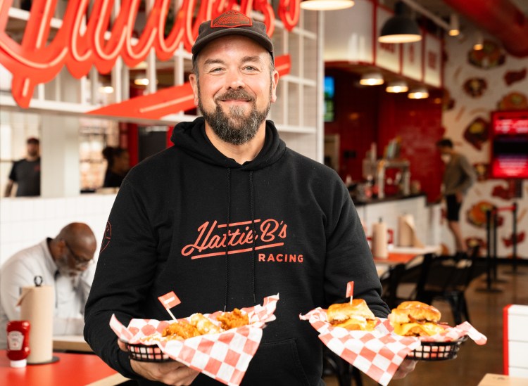 Executive Chef Brian Morris holds a plate of chicken and waffles and a plate of chicken biscuits at Hattie B’s at the Factory in Franklin on Monday, April 8, 2024, two days before the location rolled out its new breakfast menu.