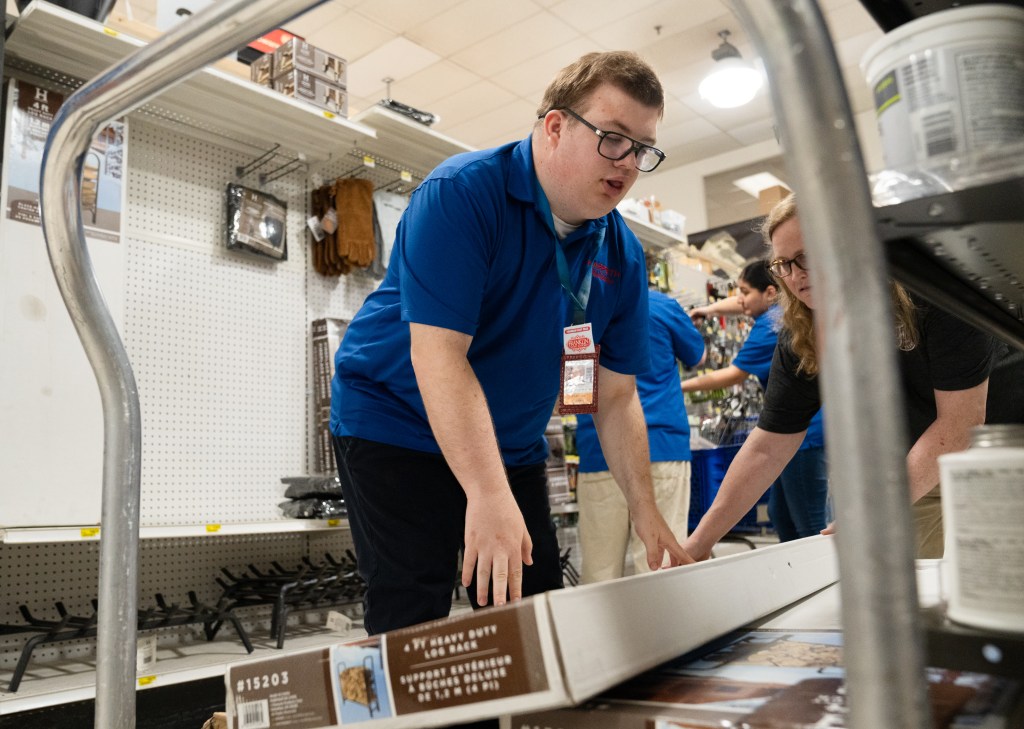 FHS Transition 2 student Dylan loads inventory onto a cart to be moved at Harpeth True Value in Franklin on Monday, May 13, 2024.