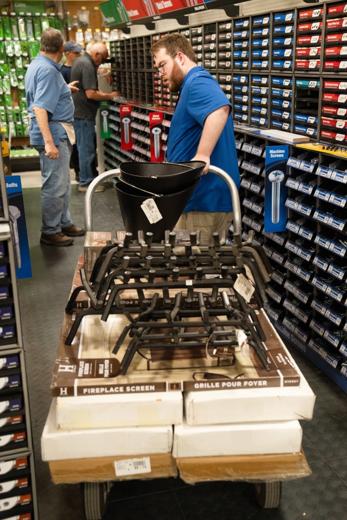 Stephen moves a cart full of inventory through the store at Harpeth True Value in Franklin on Monday, May 13, 2024.