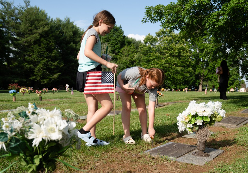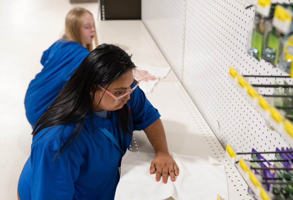 Sandra (in front) and Abby wipe down the cleared shelves at Harpeth True Value after their classmates removed the inventory to create a new display in Franklin on Monday, May 13, 2024.