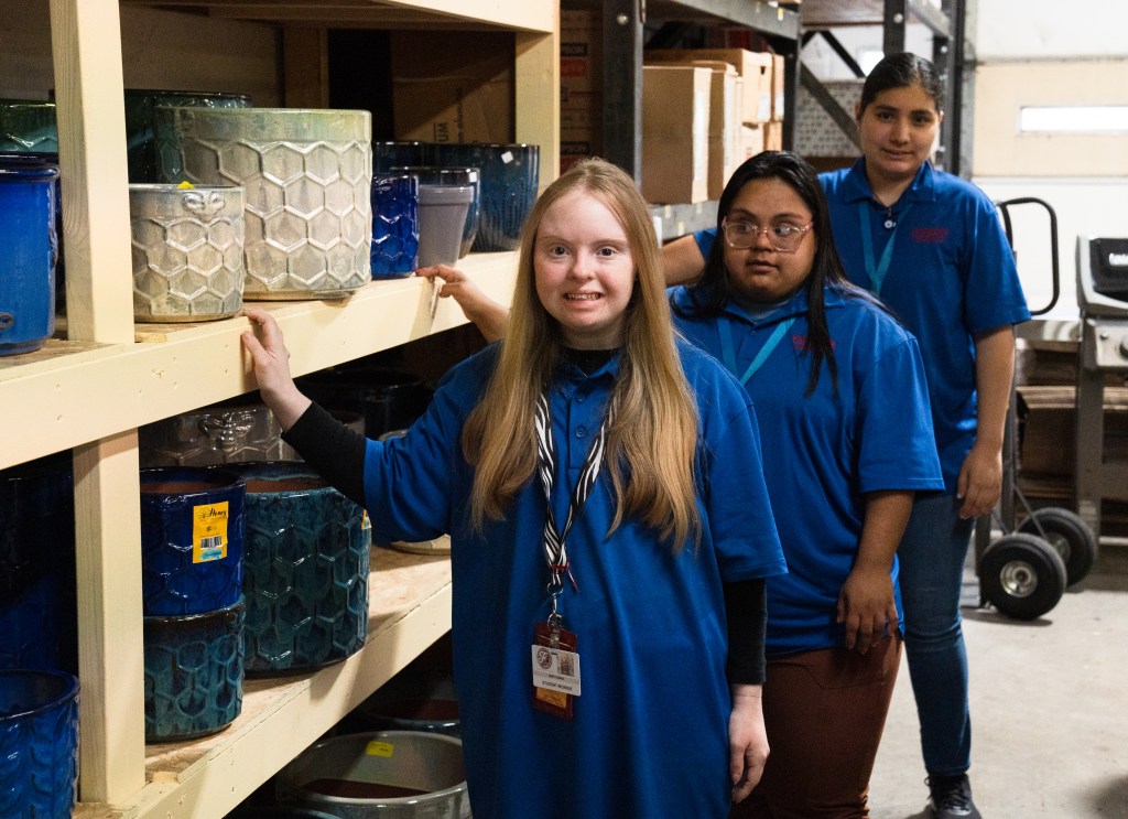 Abby, Sandra and Diana show off the shelf they spent months painting for the garden center at Harpeth True Value in Franklin on Monday, May 13, 2024.