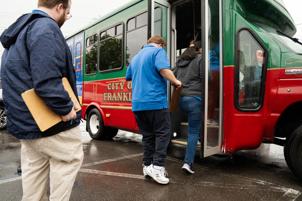 FHS Transition 2 students get back on the Franklin Transit trolley to return to school after their work at Harpeth True Value in Franklin on Monday, May 13, 2024.